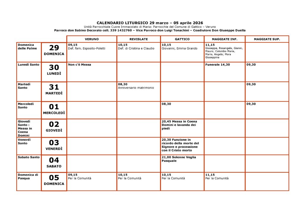 DOMENICA DELLE PALME – 29 marzo 2026 Avvisi Settimana DOMENICA DELLE PALME – 29 marzo 2026 Leggi tutto »